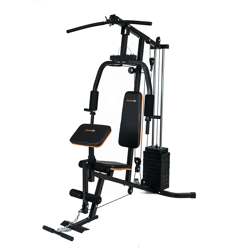 Daugiafunkcinis jėgos treniruoklis Everfit MSK-500, su kuriuo galima atlikti daugiau kaip 15 pratimų įvairioms raumenų grupėms. 45 kg svorių blokas; Rėmo profilis 45 x 45 cm; Sėdynės matmenys 40 x 33 x 4,5 cm; Atlošo matmenys 28,5 x 61 x 4,5 cm;